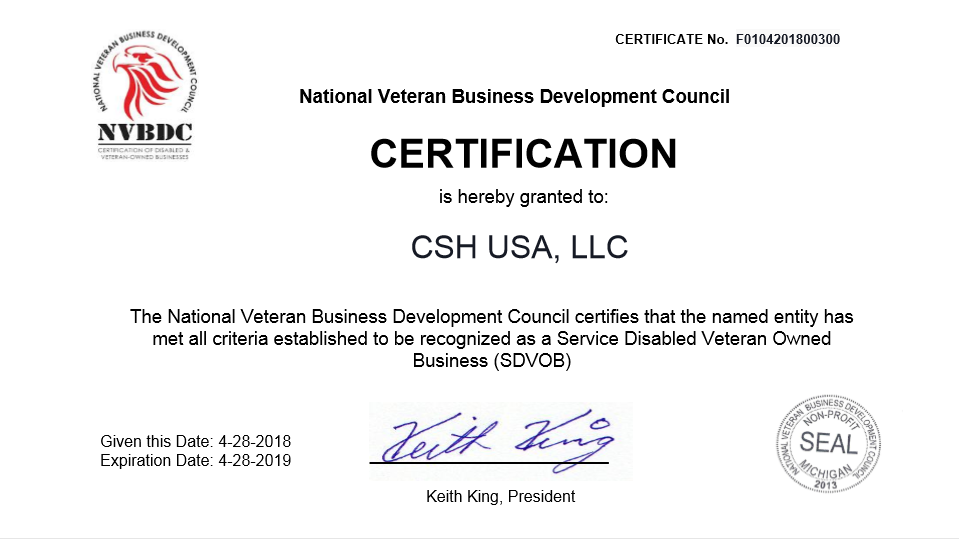 CSH Group LLC is a Service Disabled Veteran Owned Small Business (SDVOSB) company. CSH provides the highest level of customer service to our clients while always upholding the highest standards of integrity. CSH provides commercial, municipal and federal government contract mangers with turnkey solutions and functionality across the wide spectrum of contracting services we provide.